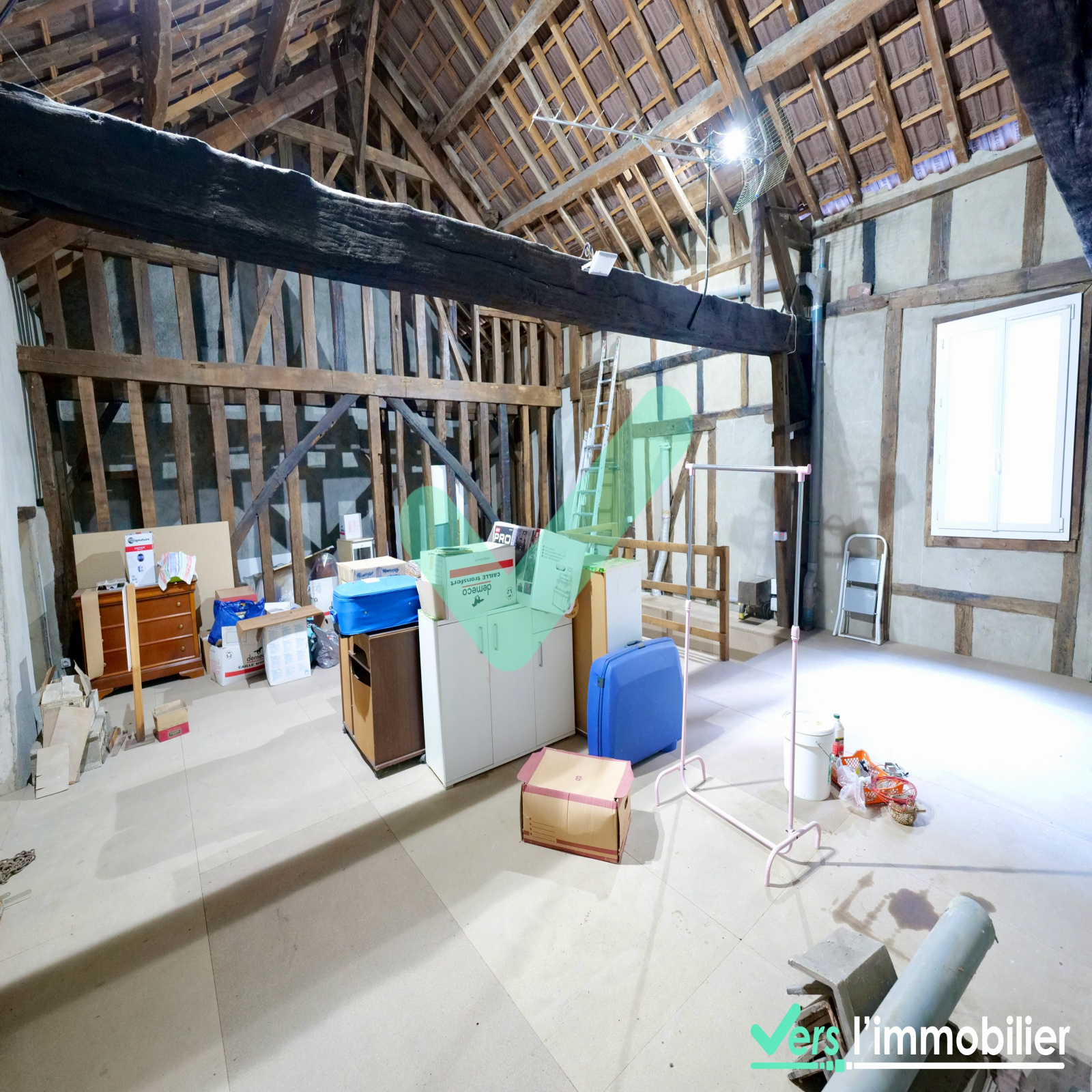 Un grenier de 78 m2 avec poutres apparentes accessible par le rez-de-chaussée peut être aménagé.