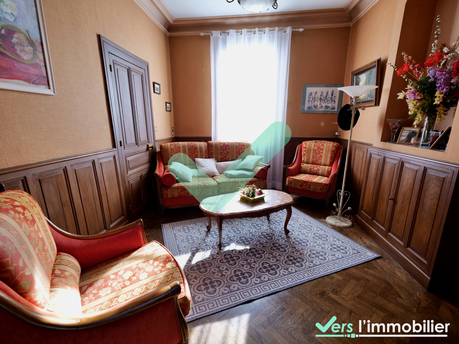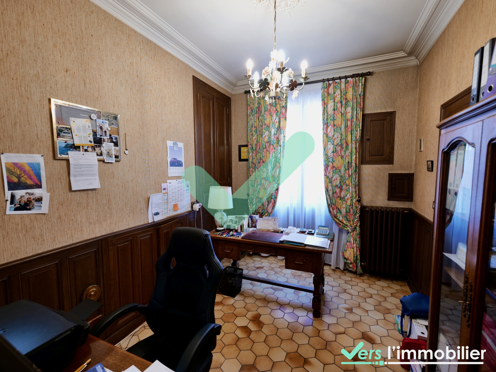 Au rez-de-chaussée : l'entrée dessert le salon avec parquet et moulures d'époque, la salle à manger de 28 m2 avec sa cheminée et sa belle hauteur sous plafond de plus de 3,50m. Un plafond ajouré vous apporte de la lumière naturelle toute la journée. Vous retrouverez également au rdc une grande cuisine, un bureau (pouvant faire office de chambre) et des WC.